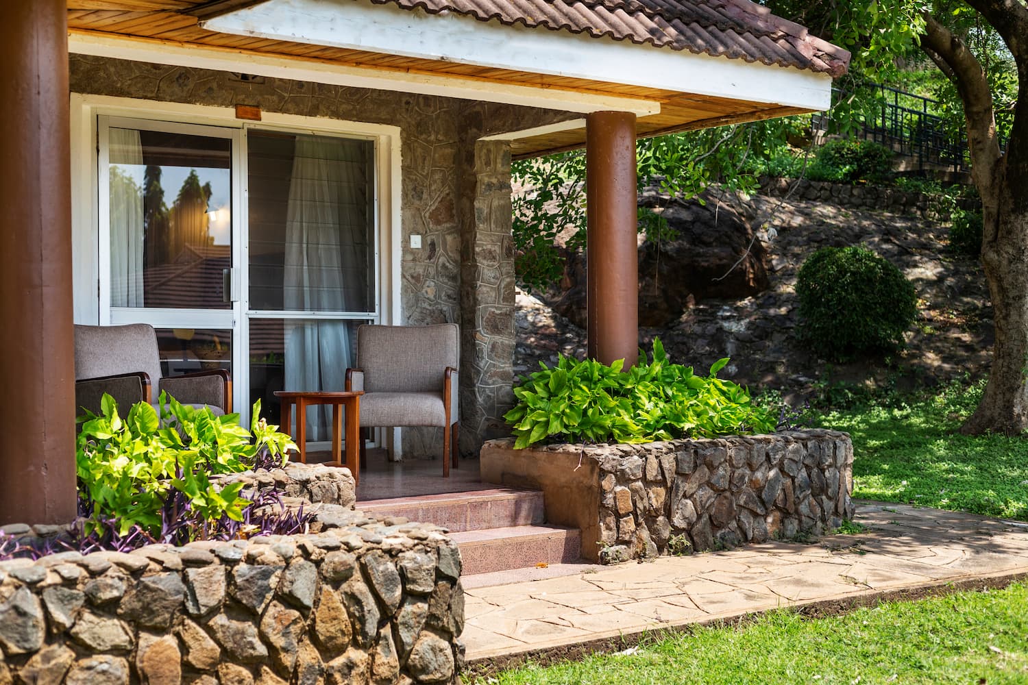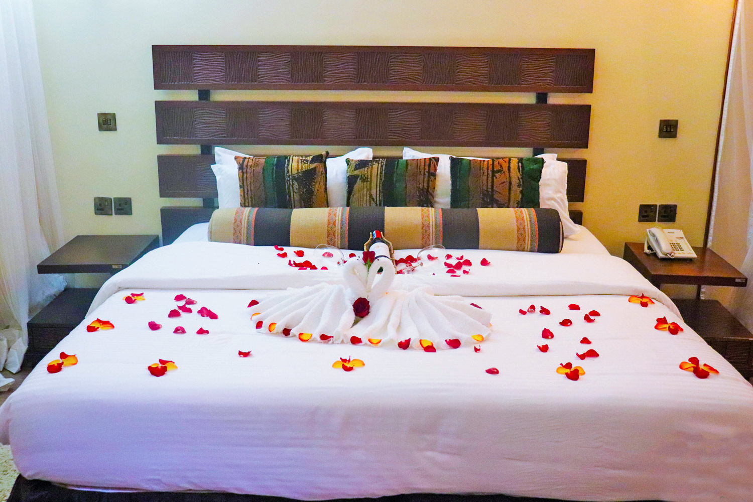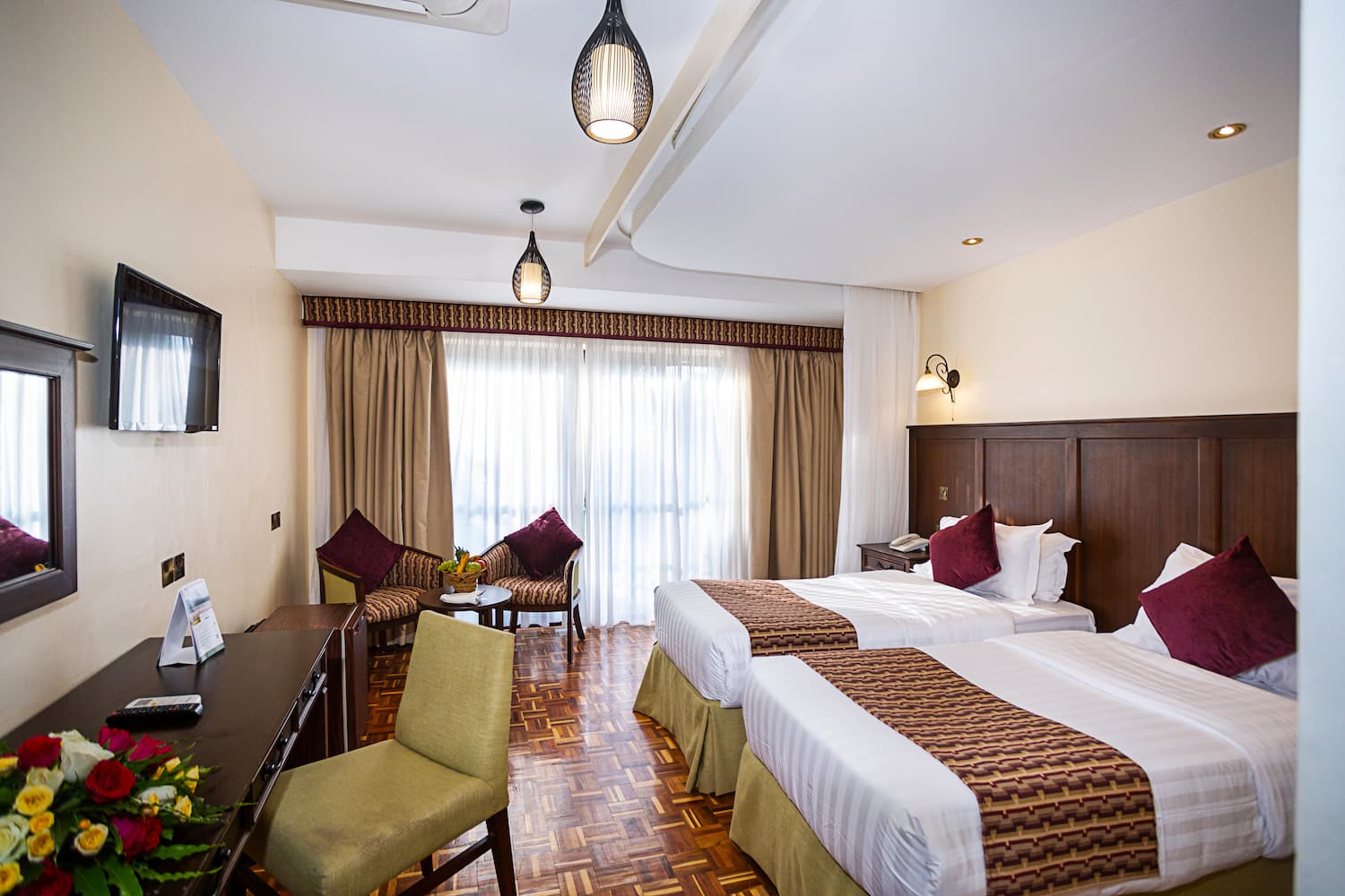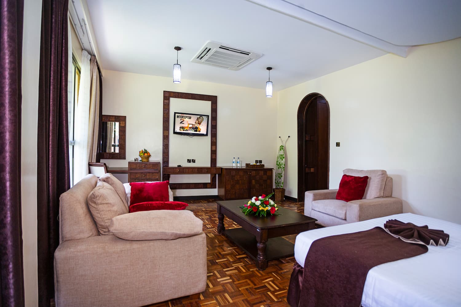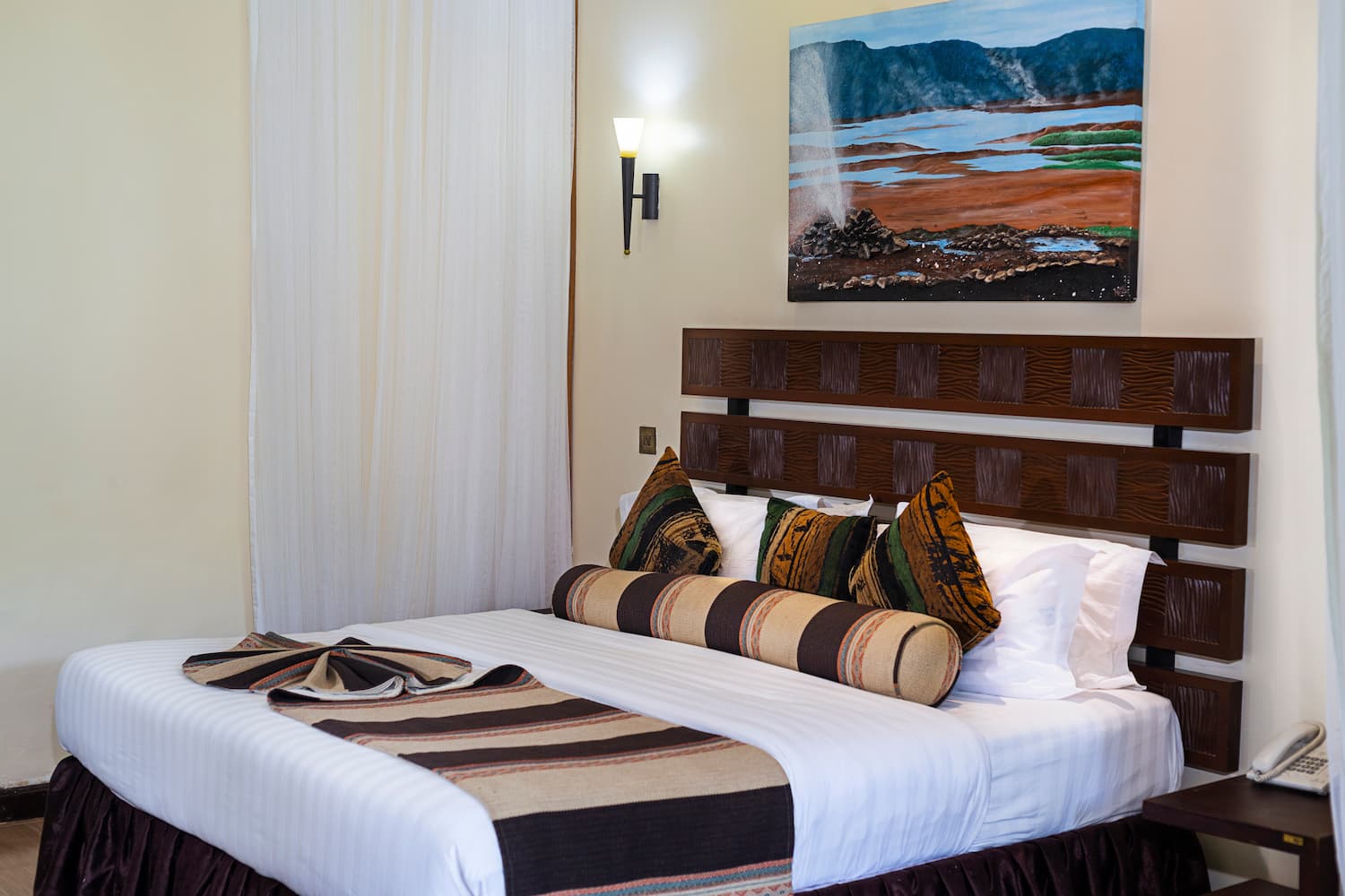This standard room looks amazing with the African fabrics that blends in with the antique wood finish that is just perfect within the barring savannah environment.