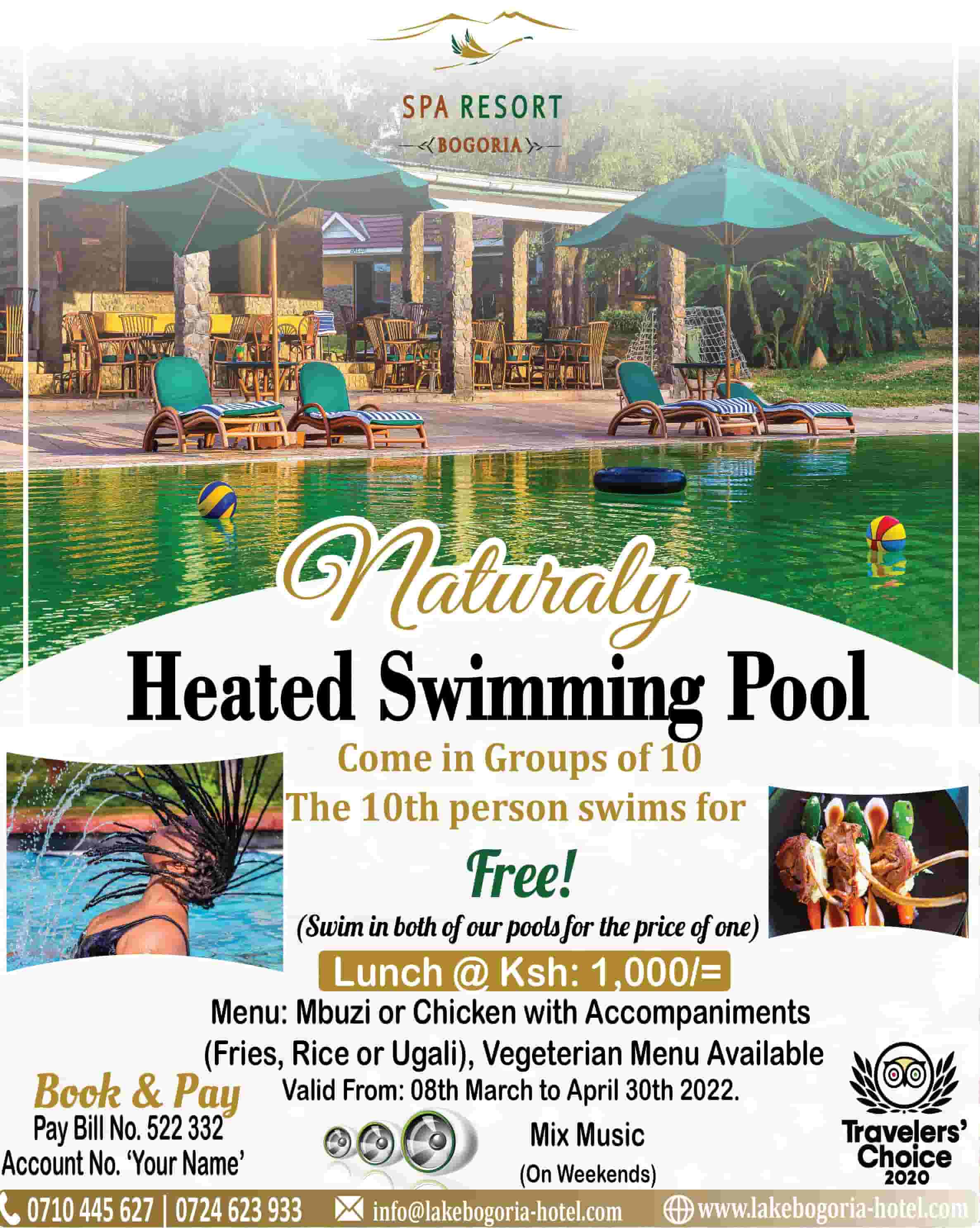 Lake Bogoria Spa Resort is the only resort in Kenya with a naturally heated pool. The resort is known as the healing place because of the therapeutic values associated with the spa and the hot spring geysers."Its the jewel of the Rift Valley", Bishop Hanington on the first sight. "The most beautiful view in Africa" set in the acacia surroundings of the floor of the Great Rift Valley.